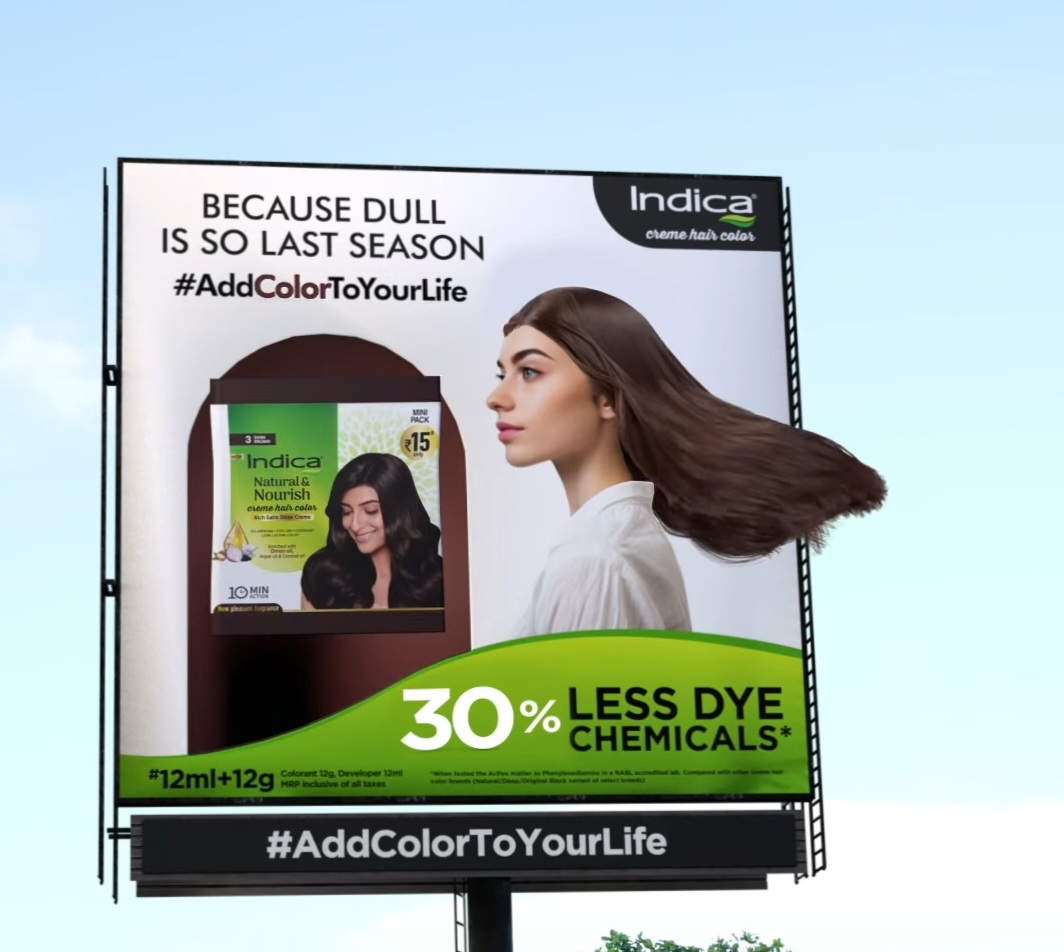 Designed to captivate and resonate with modern consumers, the CGI video showcases an interactive billboard featuring a girl with long, grey hair. With every swivel of the Indica Crème Hair Color packshot, the grey hair changes color to vibrant shades of Natural Black, Dark Brown, and Burgundy.