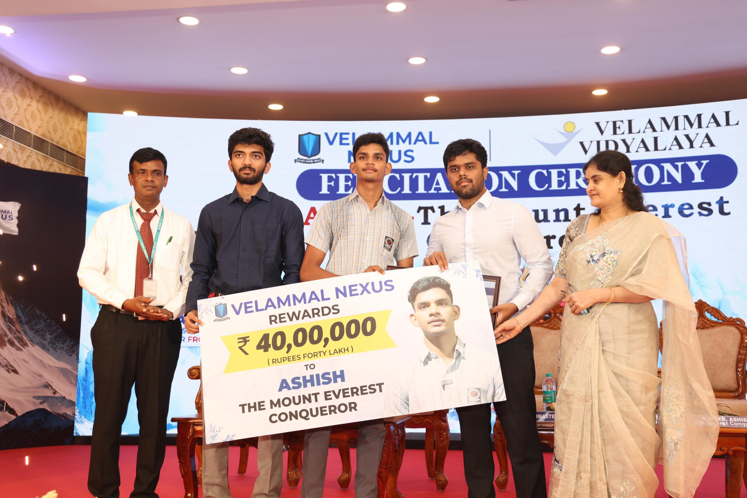 Velammal Nexus Honours Everest Conqueror Ashish with ₹40 Lakhs Cash Award – Grand Felicitation in the Presence of Chess Maestro Gukesh