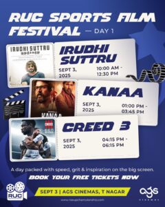 Chennai will witness a unique celebration of sports and cinema this August as the RUC Sports Film Festival premieres at AGS Cinemas, T Nagar, on september 3 and 4 th For two full days, from 9 AM to 6 PM, audiences will experience the thrill of sports on the big screen through a handpicked selection of blockbuster and critically acclaimed films in English, Hindi and Tamil.