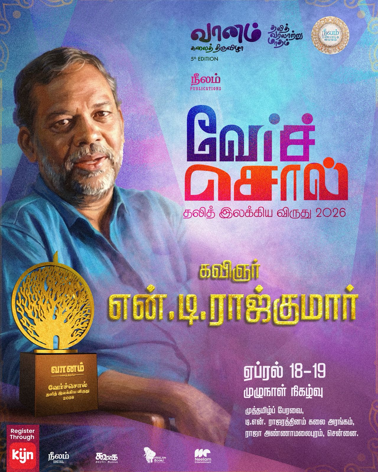சமவெளியின் நாகரிக வாழ்வால் செரிக்கப்படாத பழங்குடி சொல்மரபை நவீன தமிழ்க் கவிதைக்கு அறிமுகப்படுத்தியவர் என்.டி.ராஜ்குமார். அவரது கவிதைகள் வடிவத்தால் மட்டுமல்லாமல் உள்ளடக்கத்தாலும் தமிழில் முக்கியப் பங்காற்றியிருக்கின்றன. வைதீக மதங்களையும், அதன் பொய்க்கதைகளையும் கலைத்துக் காட்டுவதோடு, பூர்வக்குடிகள் தங்களுக்கெனச் சொந்தமாகக் கொண்டிருந்த பெரும் பரப்பைத் தன் கவிதைக்குள் விரித்துக் காட்டின. நீலம் பண்பாட்டு மையம் சார்பாக ‘வேர்ச்சொல் தலித் இலக்கியக் கூடுகை’ இரண்டு நாட்கள் நிகழ்வாக வரும் ஏப்ரல் 18, 19 தேதிகளில் சென்னை முத்தமிழ்ப் பேரவை, டி.என்.இராஜரத்தினம் கலை அரங்கத்தில் நடைபெறவிருக்கிறது. கூடுகையின் இரண்டாம் நாள் (19.04.2026) மாலை நான்கு மணியளவில், 2026ஆம் ஆண்டுக்கான வேர்ச்சொல் இலக்கிய விருதை, கவிஞர் என்.டி.ராஜ்குமார் அவர்களுக்கு வழங்கப்படுகிறது